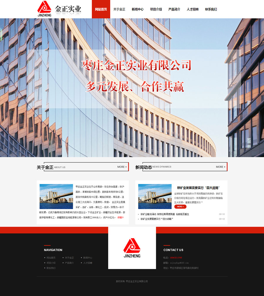 祝賀金正實業(yè)有限公司網(wǎng)站上線 公司介紹: 棗莊金正實業(yè)位于山東南部。處在京臺高速、京滬高鐵、津浦鐵路中間位置,距鐵路專用貨場5公里,距徐州觀音機場70公里,毗臨日照港、青島港、連云港三大出?冢煌ū憷、快捷。 金正實業(yè)是集采礦、選礦、冶煉、煤化工、投資、貿(mào)易為一體不斷發(fā)展,已成為魯南地區(qū)較有影響力的大型企業(yè)。下設金正礦業(yè)、新疆雙全五洋能源、并參股伊犁特煤化工、新疆國投寶地能源等公司,F(xiàn)有職工3000余人,資產(chǎn)20億元。先后獲得棗莊百強企業(yè)、突出貢獻企業(yè)、誠信經(jīng)營企業(yè)、納稅十強企業(yè)、山東省工會工作先進企業(yè)等榮譽稱號。 金正礦業(yè)年產(chǎn)鐵精粉60萬噸,金正實業(yè)年產(chǎn)鑄造用生鐵26萬噸,主要銷往江蘇、浙江、福建、安徽、河北、山東等地,深受廣大客戶好評。 公司始終秉承“多元發(fā)展、合作共贏”的經(jīng)營理念,遵循“精誠團結(jié)、銳意進取”的企業(yè)精神。竭誠為客戶提供優(yōu)質(zhì)的產(chǎn)品和服務。真誠歡迎各界同仁前來指導、合作,我們愿與您風雨同舟、攜手共創(chuàng)美好未來。 棗莊金正實業(yè)有限公司